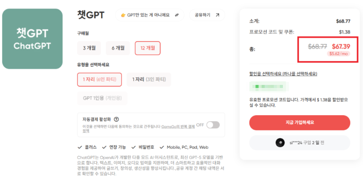 ✓ 2025년 기준, ChatGPT Plus 정가 $20 → 할인가 $5.53